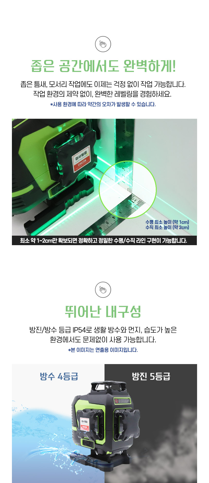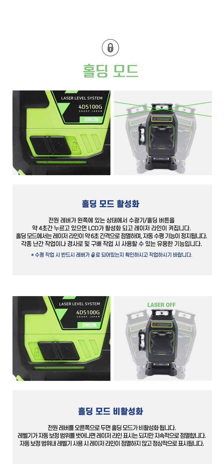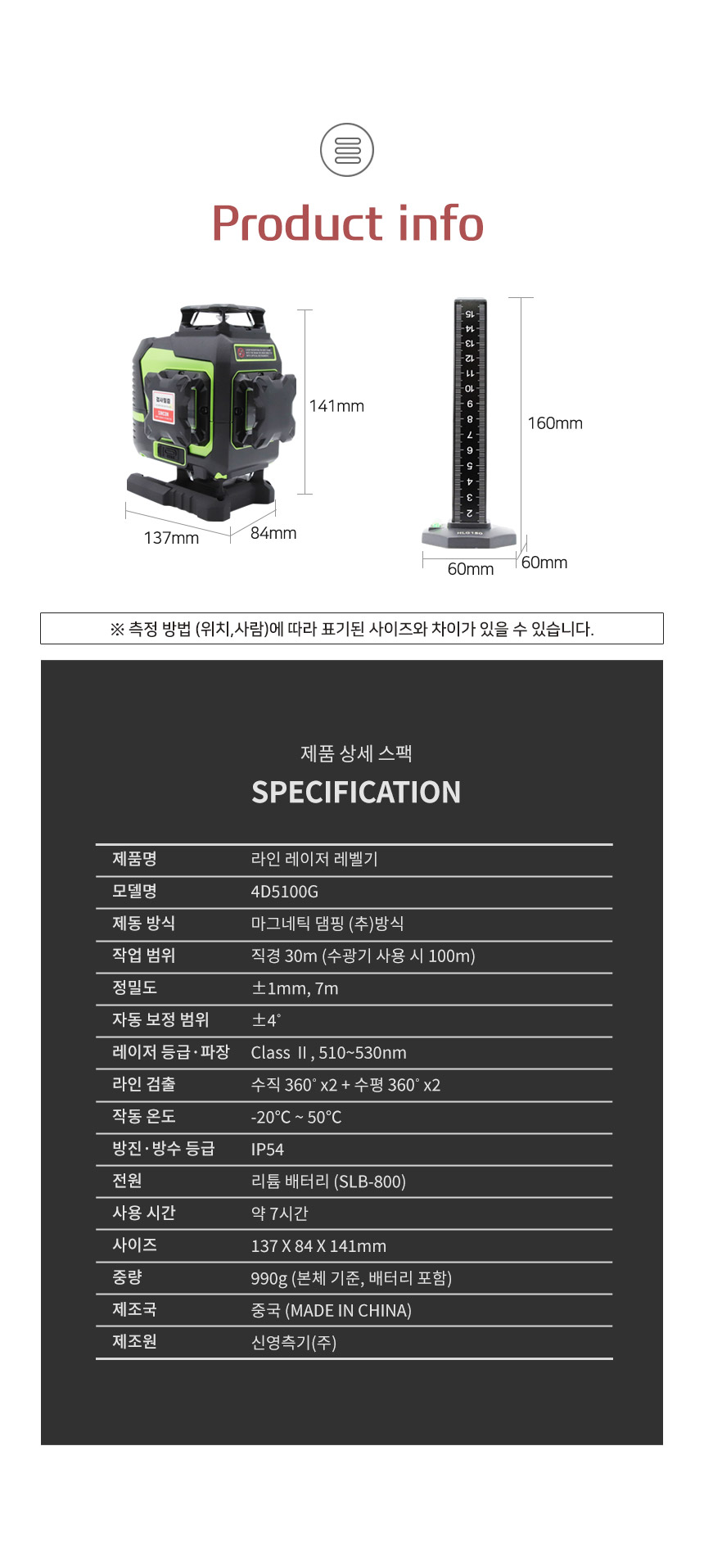 홈 / 제품소개 / SINCON / 레이저레벨기 / 4D 타입 레이저 레벨기 / [신콘] 4D 라인레이저레벨기 4D5100G(오프라인) [신콘] 4D 라인레이저레벨기 4D5100G(오프라인) 모델명 : 4D5100G 제동방식 : 마그네틱댐핑(추) 다이오드 : 샤프 레드 LD 다이오드 라인검출 : 수직360˚ X 2 + 수평360˚ X 2 전원 : SLB-800 수광기(옵션) : SD2000G 스크류사이즈 : 본체 6.35mm, 15.875mm 삼각다리(옵션) : 15.875mm, ELT50 다리 이상 사용 권장 카테고리: 4D 타입 레이저 레벨기, SINCON, 레이저레벨기, 제품소개 태그: 4D레벨기, 4D레이저, 4D추방식, 라인레벨, 라인레이저, 라인레이저레벨, 레벨기, 레이저레벨, 신콘라인레이저, 신콘레벨기, 신콘레이저, 신콘추방식, 추방식레벨, 추방식레이저, 포디레이저, 포디추방식 설명 설명 연관 상품 [신콘] 라인레이저레벨기 SG-710 (오프라인) 더 보기 [신콘] 자동레벨기 B32 (32배율) 더 보기 [신콘] 라인레이저레벨기 SL-445P 더 보기 [신콘] 자동레벨기 A32 (32배율) 더 보기