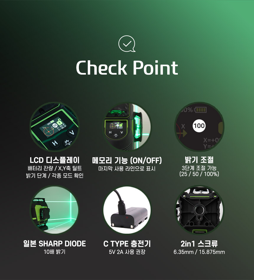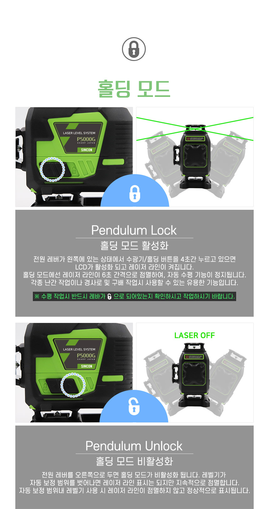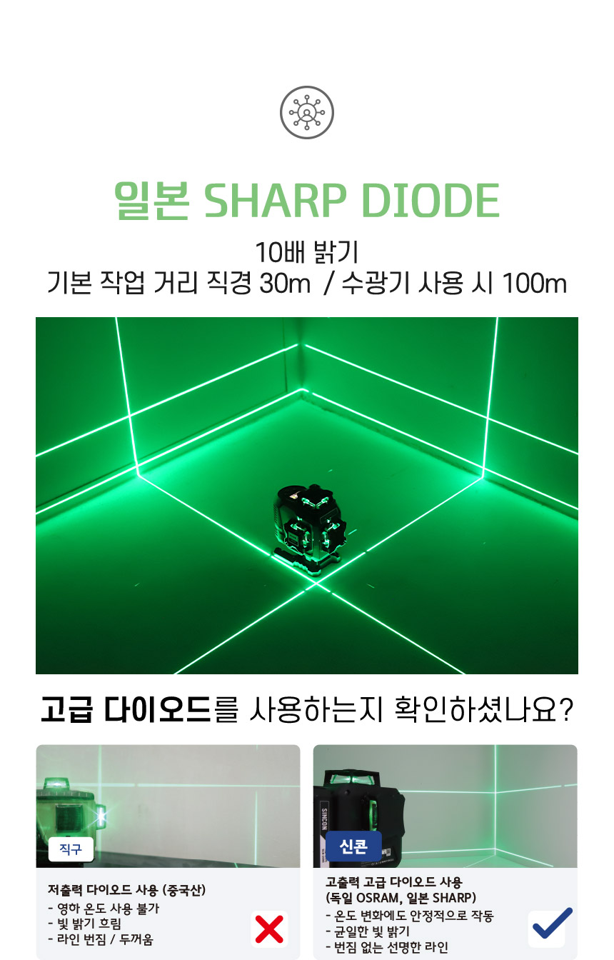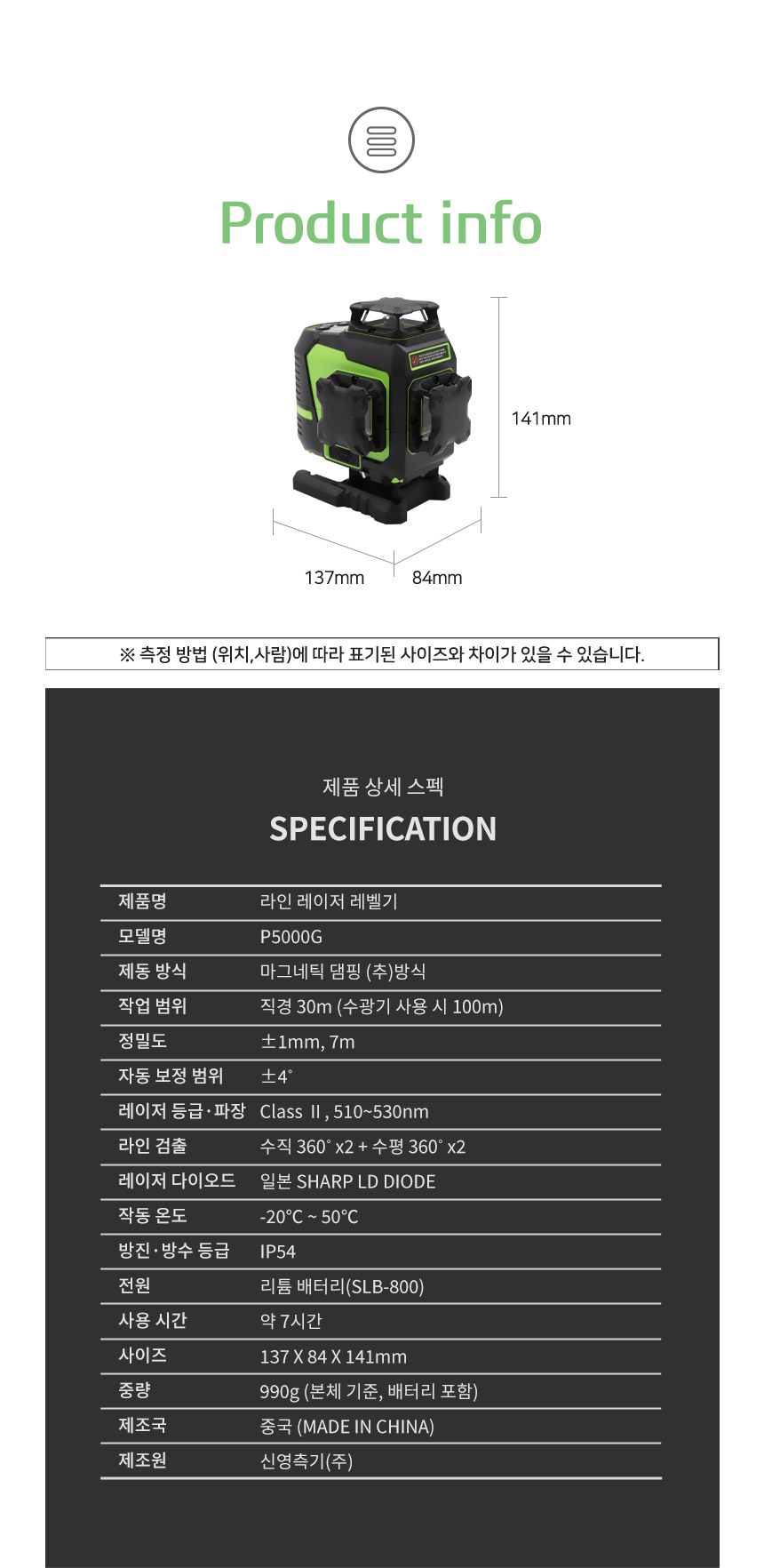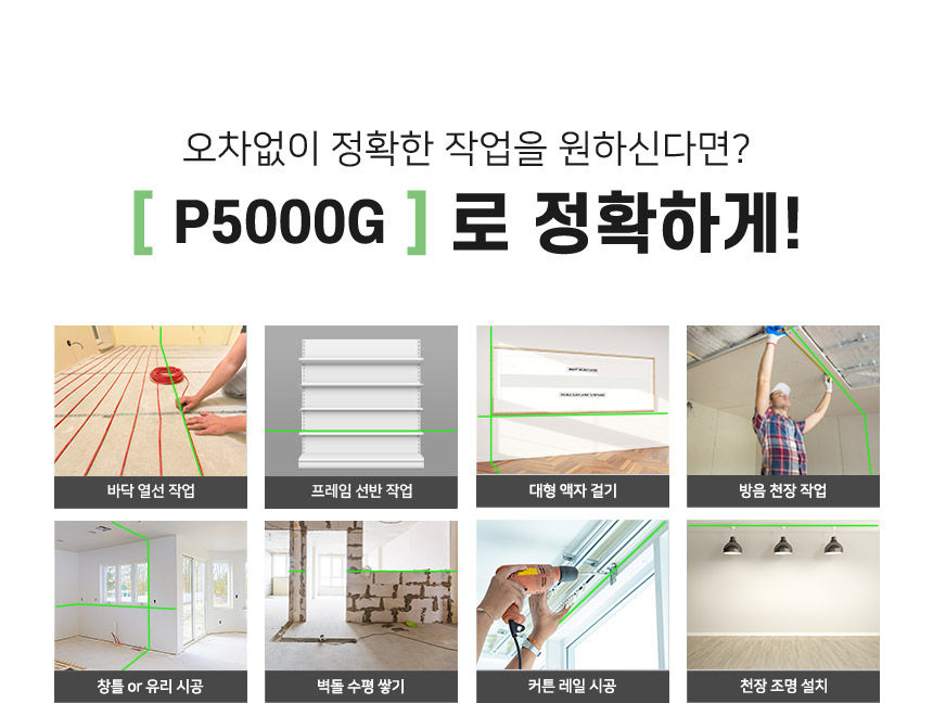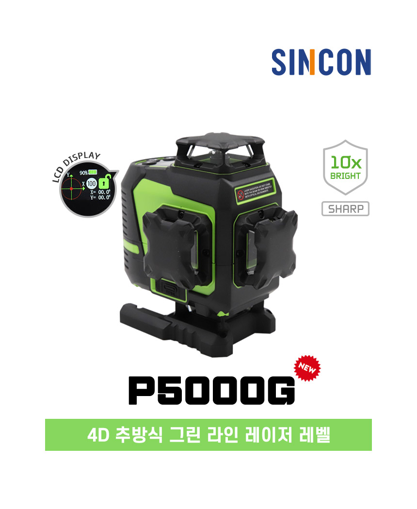 홈 / 제품소개 / SINCON / 레이저레벨기 / 4D 타입 레이저 레벨기 / [신콘] 4D 라인레이저레벨기 P5000G [신콘] 4D 라인레이저레벨기 P5000G 모델명 : P5000G 제동방식 : 마그네틱댐핑(추) 다이오드 : 샤프 그린 LD 다이오드 라인검출 : 수직360˚ X 2 + 수평360˚ X 2 전원 : SLB-800 수광기(옵션) : SD2000G 스크류사이즈 : 본체 6.35mm, 15.875mm 삼각다리(옵션) : 15.875mm, ELT50 다리 이상 사용 권장 카테고리: 4D 타입 레이저 레벨기, SINCON, 레이저레벨기, 제품소개 태그: 4D레벨기, 4D레이저, 4D추방식, 라인레벨, 라인레이저, 라인레이저레벨, 레벨기, 레이저레벨, 신콘라인레이저, 신콘레벨기, 신콘레이저, 신콘추방식, 추방식레벨, 추방식레이저, 포디레이저, 포디추방식 설명 설명 연관 상품 [신콘] 자동레벨기 S28 (28배율) 더 보기 [신콘] 라인레이저레벨기 SG-710 (오프라인) 더 보기 [신콘] 라인레이저레벨기 SL-500G 더 보기 [신콘] 라인레이저레벨기 SG-510 (오프라인) 더 보기